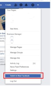 في الصفحة الرئيسية لحسابك على فيسبوك، وفي أعلى يمين الصفحة، قم بالضغط على السهم المنسدل الصغير، واختر “التبديل إلى فيسبوك الجديد” Switch to new Facebook.