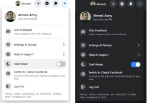 في التصميم الجديد، يمكنك تفعيل الوضع الداكن Dark Mode من القائمة المنسدلة في أعلى يمين صفحة فيسبوك. قم بتفعيل الوضع واستمتع بالوضع الداكن.