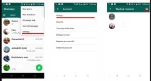 وفي هواتف أندرويد، يمكنك تفعيل خاصية الحظر Block بالدخول التطبيق، والضغط على أيقونة النقاط الثلاث أعلى يمين واجهة التطبيق لفتح القائمة، ثم الدخول إلى الإعدادات Settings ثم الحساب Account ثم الخصوصية Privacy ثم الاتصالات المحظورة Blocked Contacts.