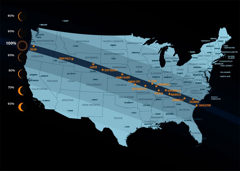 تشهد قارة أمريكا الشمالية، اليوم الإثنين، ظاهرة الكسوف الكلي للشمس، عندما يحجب القمر ضوء الشمس عن معظم القارة، ويبدأ من المحيط الهادىء لينتهي في المحيط الأطلنطي عابرا الولايات المتحدة الأمريكية من الشمال الغربي إلى الساحل الجنوبي الشرقي.