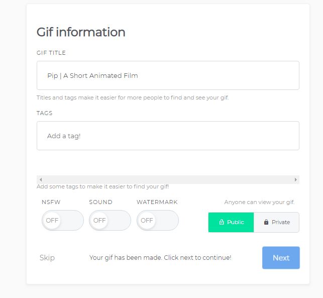 سيقوم الموقع بعمل الصورة المتحركة لك، اضغط التالي (Next)، وانسخ رابط الصورة المتحركة لمشاركتها على وسائل التواصل الاجتماعي أو تنزيلها على جهازك.