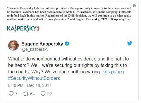 وقالت الشركة أن الولايات المتحدة الأمريكية حرمتها من حقوقها القانونية الواجبة من خلال حظر برمجياتها من الوكالات الحكومية، وتجاهلت نفيها لوجود أي صلة بينها وبين الحكومة الروسية، وأنها لن تسعى أبدا للتجسس السيبراني.