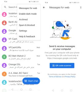 قم الآن بفتح تطبيق Message على هاتفك الذكي، ثم ادخل إلى القائمة الرئيسية به بالضغط على النقاط الثلاثة الموجودة أعلى يمين شاشة التطبيق، ثم اضغط على Messages for web.