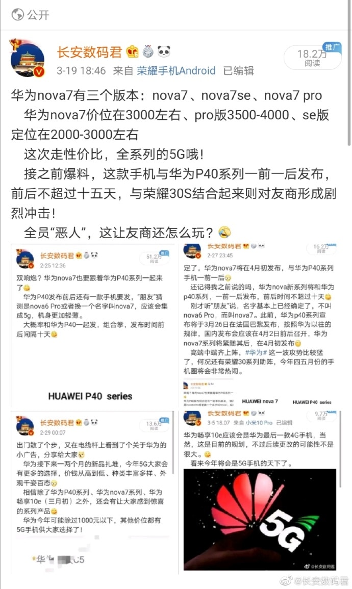 وقال المنشور أن هواوي تعتزم الإعلان عن هواتف “نوفا 7″ Nova 7 و”نوفا 7 إس إي” Nova 7 SE و”نوفا 7 برو” Nova 7 Pro، والمقرر أن تعمل بمعالج هواوي الشهير كيرين Kirin، حيث يتوقع أن يعمل هاتف نوفا 7 بمعالج كيرين 985 وهاتف نوفا 7 إس إي بمعالج كيرين 820 وهاتف نوفا 7 برو بمعالج كيرين 990 5جي.