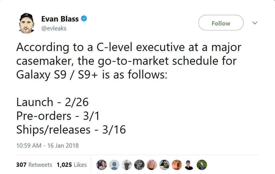 كما أن تأكيد الموعد المحدد للإعلان عن الهاتف بنسختيه S9 وS9 Plus، جاء عبر حساب إيفان بلاس عبر تويتر الشهير بتسريباته الموثوقة، إذ نقل عن مصدر مطلع أن الموعد المُحدد للإعلان عن الهاتفين هو 26 فبراير القادم.